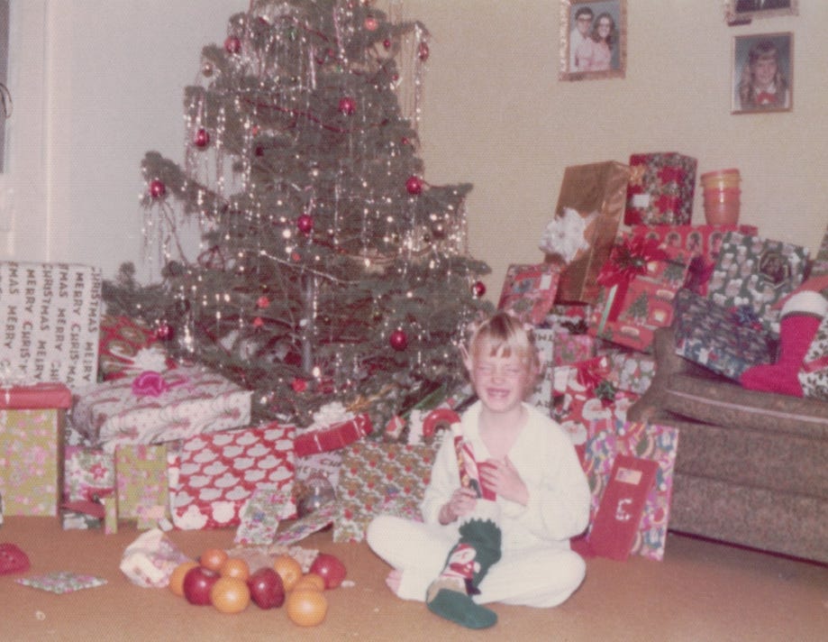 I believe the next photo was taken the year I was in kindergarten, and several of our family traditions are visible and evidently in place by then. Always the same type of tree and the same type of decorations, we always stacked the presents the same up the walls, and there were always the big plastic stocking with candy inside, the giant round peppermint stick and the huge oranges and apples. You can’t hardly tell, but there’s a real coconut there too just for me, and in later years of larger stockings, it would always be down at the toe of mine. And yes, those are curlers in my hair, very 70s.